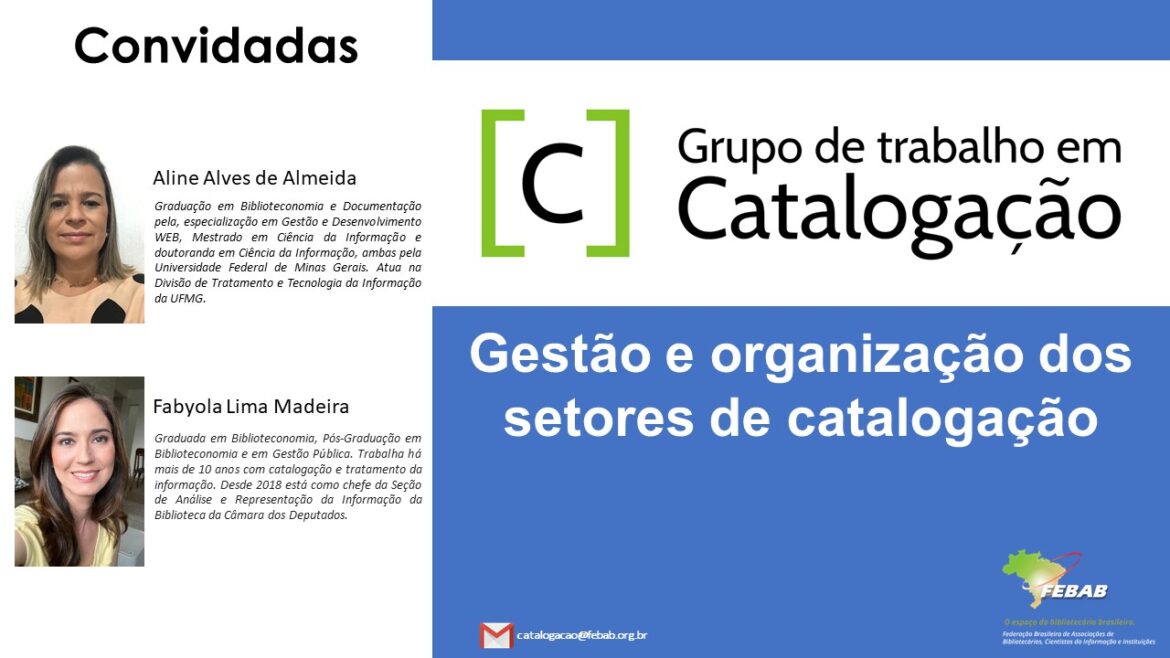 No dia 29/07/2021, o Grupo de Trabalho em Catalogação da FEBAB convida as bibliotecárias Aline de Almeida (UFMG) e Fabyola Madeira (Câmara dos Deputados) para conversarem conosco sobre a parte cotidiana da gestão e organização dos setores de catalogação em bibliotecas, ou seja, o dia-a-dia dos catalogadores para além das regras de catalogação.