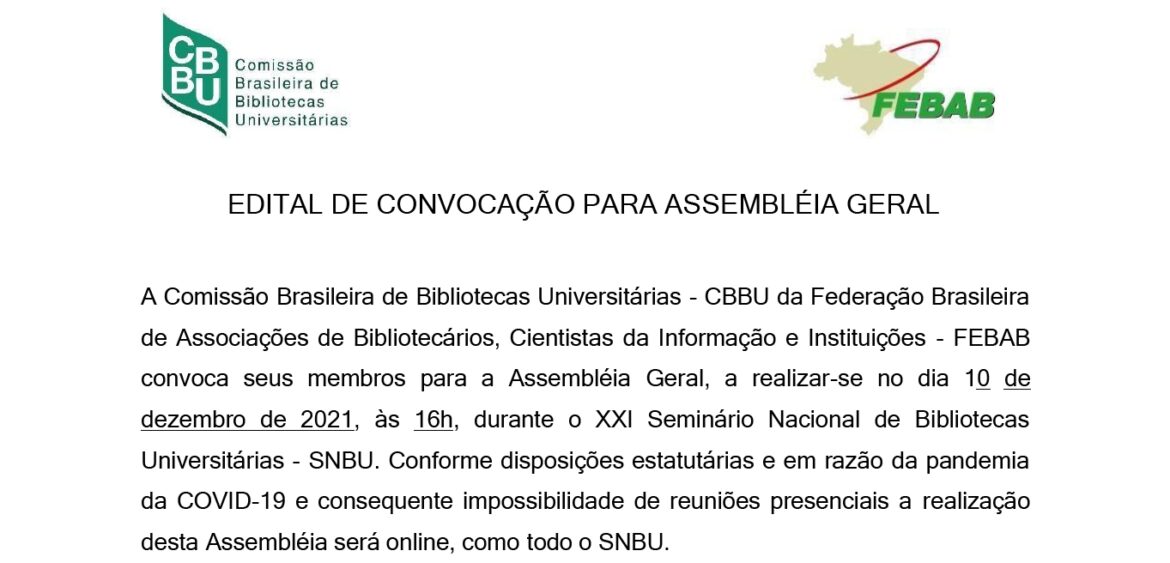A Comissão Brasileira de Bibliotecas Universitárias – CBBU da Federação Brasileira de Associações de Bibliotecários, Cientistas da Informação e Instituições – FEBAB convoca seus membros para a Assembléia Geral, a realizar-se no dia 10 de dezembro de 2021, às 16h, durante o XXI Seminário Nacional de Bibliotecas Universitárias – SNBU. Conforme disposições estatutárias e em razão da pandemia da COVID-19 e consequente impossibilidade de reuniões presenciais a realização desta Assembléia será online, como todo o SNBU.