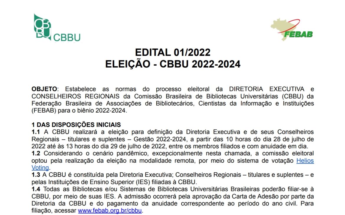 OBJETO: Estabelece as normas do processo eleitoral da DIRETORIA EXECUTIVA e CONSELHEIROS REGIONAIS da Comissão Brasileira de Bibliotecas Universitárias (CBBU) da Federação Brasileira de Associações de Bibliotecários, Cientistas da Informação e Instituições (FEBAB) para o biênio 2022-2024.
